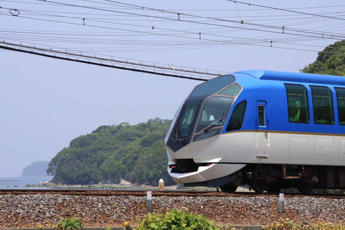 鳥羽城跡は、登ると言う程でなく階段がありますので楽に上れます、ご安心ください。鳥羽駅から10分程度で着きます。私も大阪線の鳥羽・賢島辺りで海を入れて撮影出来る場所を捜しているのですがいい場所は少ないようです。海が入る(?)場所をもう一つ紹介しておきます、観光ポスターでもよく見かけるのですが、「鳥羽商船高専前」からもチラッと海を入れることができます。ただし道路が線路より若干低くなっており、脚立等があればベストと思いますがなかなか難しいです。一度しか行ったことがないので周辺を捜せばいい場所が見つかるかも分かりません。場所は「池の浦」から国道(?)に出て鳥羽方向へ15分程度あるいたバス停「鳥羽商船高専前」です。池の浦からは「高専前」へ行く道案内がでています。以前撮った写真を載せておきます、もっと背伸びして撮ればいいのですが。