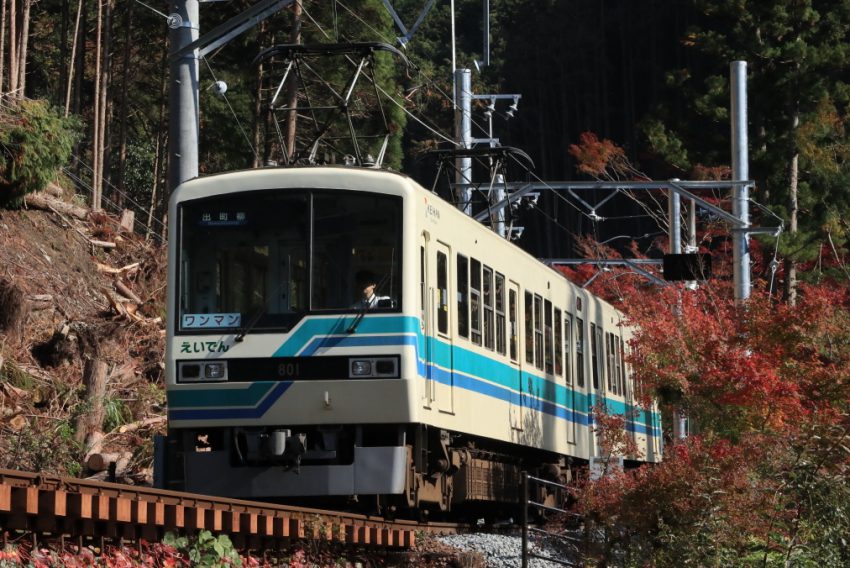 八瀬比叡山口で写したあと、宝ヶ池で乗り換えて、鞍馬線に向かいます。9月4日の台風21号による強風で、京都周辺の山は、倒木で甚大な被害を受けました。叡電も、沿線の倒木や架線柱の倒壊で長期の不通を強いられ、最後の貴船口~鞍馬が10月27日に開通したばかりでした。復旧後は初めての乗車で、窓から見ると、おびただしい倒木が山の斜面に残されたままで、被害の大きさ、完全復旧の長期化が見てとれます。終点、鞍馬駅にも、「復旧までの道のり」と題した地図が掲げられていました。すぐ折り返して、二ノ瀬駅へ向かいます。