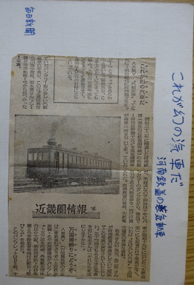 • 1900生さんのコメントを読んでビックリしました。お母さまのお姉さんが河南鉄道の専務さんをされていた方に嫁がれていたとは。河南鉄道の蒸気動車の写真が発見されたという記事を切り抜いていたことを思い出し、探したところありました。写真も載っています。この写真は湯口先輩の「日本の蒸気動車(下)」に載っている河南鉄道ろは2と同じです。記事によると藤井寺市舟橋在住の松永薫さん宅から見つかったとあります。松永薫さんは富田林、羽曳野で小・中学校の校長をされていて、また松永白洲として書道家としても活躍されたということです。現在、松永白洲さんの長男の方が記念館を開設されています。この松永白洲さんの祖父松永長三郎さんが初代の河南鉄道支配人をされていました。ところで新聞記事には「松永さんの祖父、長二郎さんが河南鉄道の専務をしていた関係でこの写真が保存されていたらしい。」とあります。記事の長二郎さんは間違いで長三郎さんではないかと思います。1900生さんのお母さまのお姉さんが嫁がれた先はこの松永長三郎さんなのでしょうか。または河南鉄道二代目以降の専務さんのところに嫁がれたのでしょうか。とにかく、1900生さんは近鉄道明寺線と数珠つなぎとなっているようですね。とにかく、ややこしいので頭の中を整理して一度「松永白洲記念館」を訪ねたいと思っています。保管されている鉄道史料に詳しい方がおられるようです。写真は新聞記事ですが、毎日新聞だとわかるのですが日付がわかりません。しかし「万国博帰りにどうぞ」という見出しがあることから1970年の記事であることがわかります。